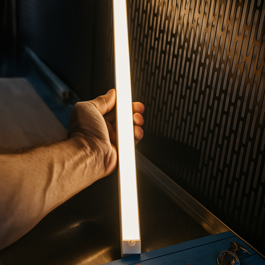 Slipp mörka hörn och svåra installationer. Denna slimmade LED-lampa tänds automatiskt när du rör dig i mörkret och laddas enkelt med USB. Perfekt för trappor, hall, kök och garderober.